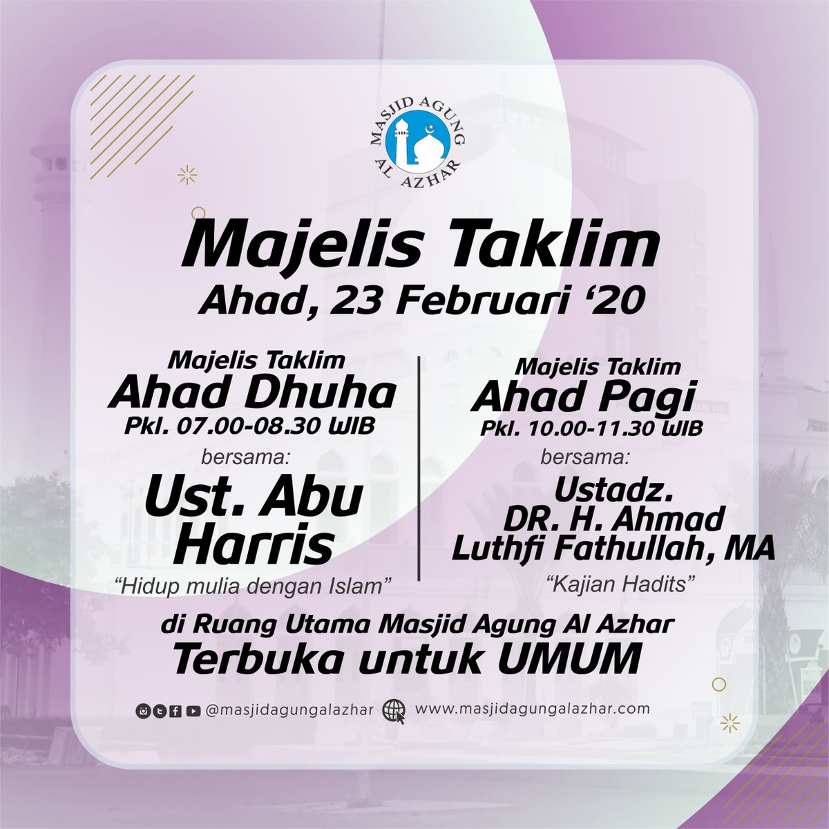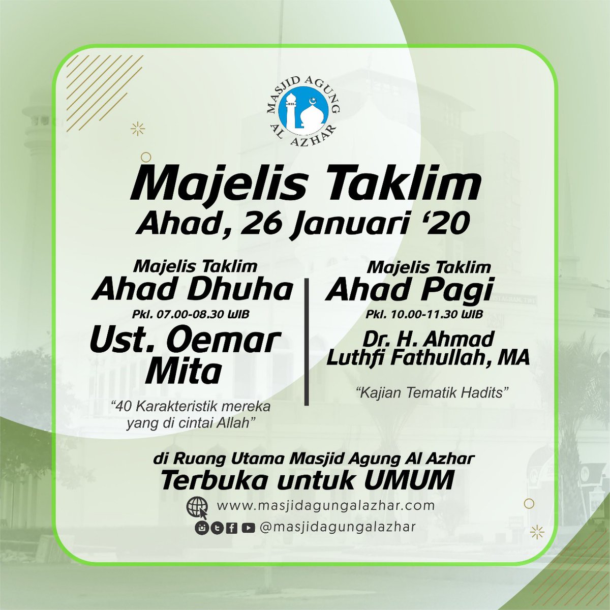 Kajian ahad pagi dengan tema kajian kitab al hikam sebagai narasumber beliau kh. Helina ratnasari binti joesoef pradjawasita dokter gigi poliklinik ypi al azhar. Cegah penyebaran corona pengurus liburkan 2 minggu kajian di masjid agung al azhar kebayoran baru masjid agung al azhar menunda kegiatan majelis taklim selama dua minggu sebagai upaya pencegahan. Lihat peta qodarullah sebagai ikhtiar pencegahan covid 19 sementara waktu kajianmuslim tidak mengirim jadwal kajian.