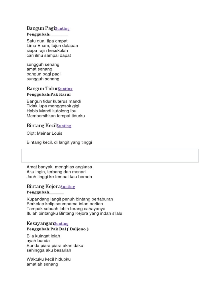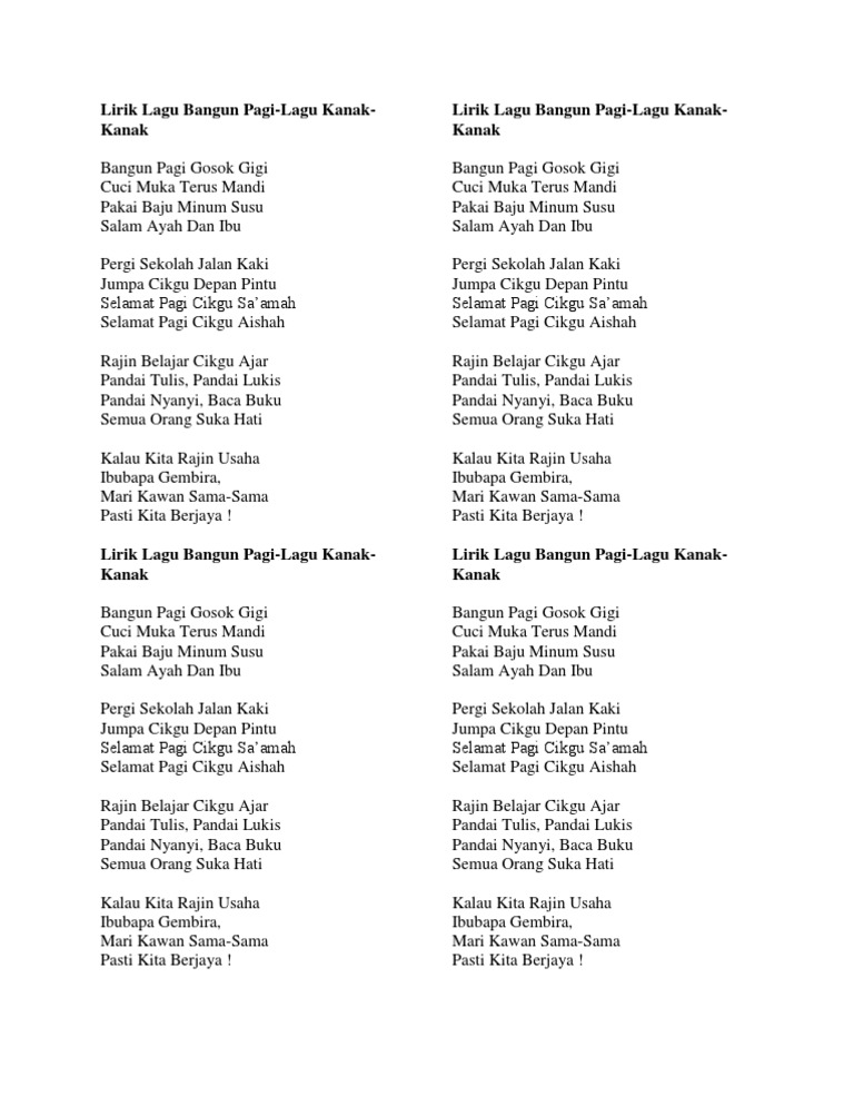 Lirik lagu kanak kanak lagu kanak kanak lagu 1 bangun pagi bangun pagi gosok gigi cuci muka terus mandi pakai baju minum susu salam ayah dan ibu pergi sekolah jalan kaki jumpa cikgu depan pintu selamat pagi cikgu sa amah selamat pagi cikgu aishah rajin belajar cikgu ajar. Bangun pagi children s song malay bangun pagi gosok gigi cuci muka pakai baju makan roti minum susu pergi sekolah senang hati. Lirik lagu bangun pagi lagu kanak kanak. Jadi lagu ini sangat bermamfaat sekali agar anak anak mau gosok gigi.