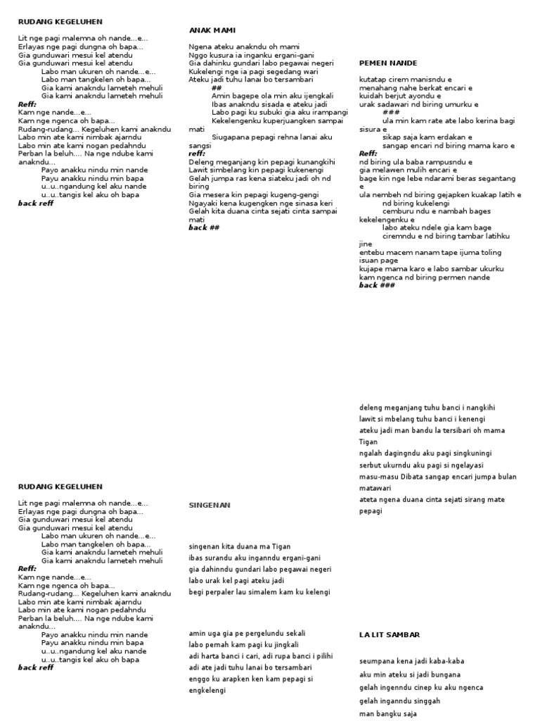 E c g erlayas nge pagi dungna oh bapa. Labo man ukuren oh nande labo man tangkelen oh bapa gia kami anakndu la meteh mehuli gia kami anakndu la meteh mehuli. Lagu rohani di doa ibuku. Lit nge pagi malemna oh nande erlayas nge pagi dung na oh bapa gia genduari mesui kel atendu gia genduari mesui kel atendu.