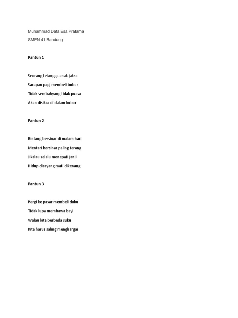 Mengucap selamat pagi dengan menggunakan pantun tentu jauh lebih menyenangkan hati si penerima. Pakai selendang terlihat anggun pergi mengaji untuk belajar ayo sayang lekaslah bangun sambut pagi udaranya segar. Walau bukan pantun lucu pantun tersebut moga bisa membuat kamut tersenyum. Jalan jalan ke kota langkat jangan lupa membeli sikat.