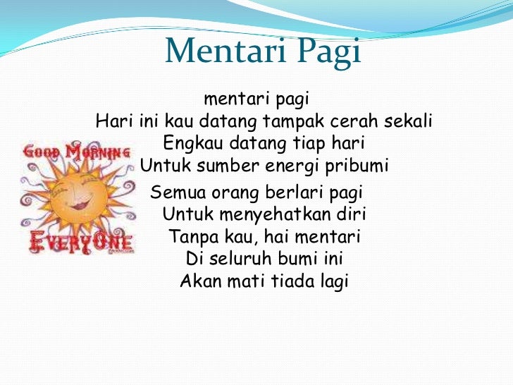 Saat pagi yang cerah kita masih santai dengan suasana lingkungan yang menyejukkan dan menenangkan. Puisi pagi yang bersinar cerah. Puisi suara pagi oleh. Anwarwonogiri terompet pagi berbunyi nenek tua ngomel meriah tak menentu rasa hati jadinya apa meriang perasaan biasa siapa yang tau oh sarapan pedas semakin menjadi.