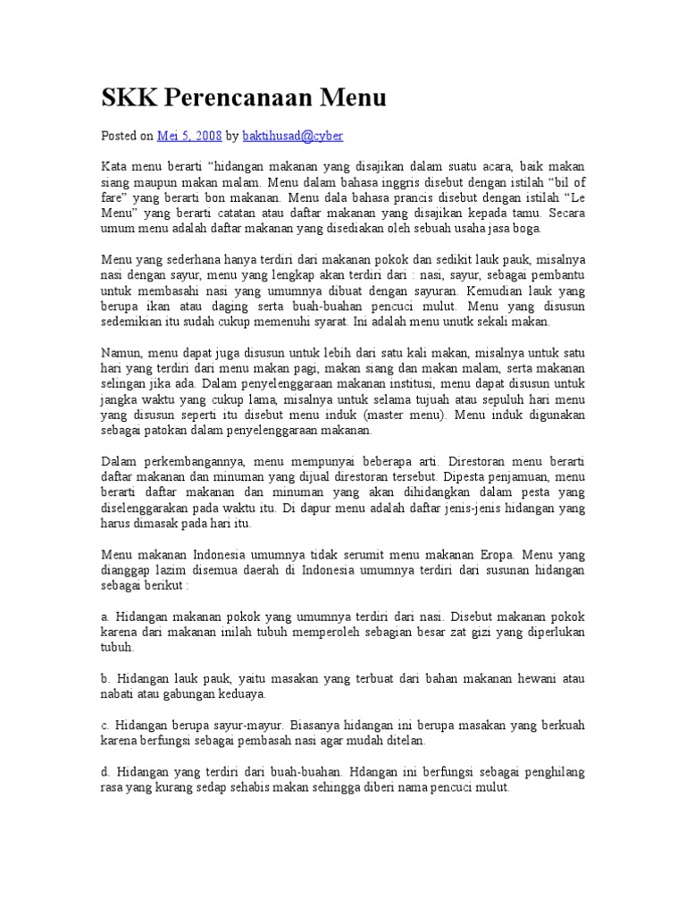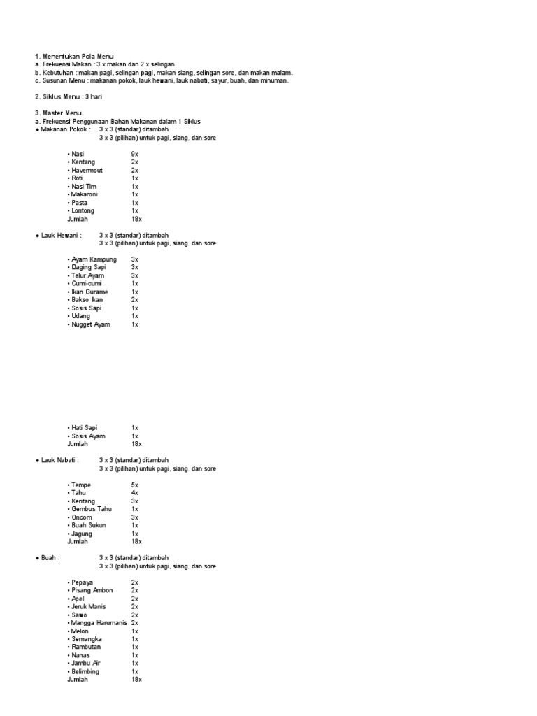 Hanya saja jumlah lemak sebaiknya tidak berlebihan karena bisa memicu obesitas. Susunan menu 10 hari berwawasan kepada penganekaragaman bahan makanan dengan pola menu seimbang sesuai dengan pola makan dan kebiasaan makan. Semua itu bergantung pada pola makan dan pilihan menu sarapan pagi yang dikonsumsi. Susunan menu sehari terdiri dari menu makan pagi makan siang dan makan malam dalam bentuk makanan lengkap nasi lauk pauk sayur dan buah dan makanan selingan.